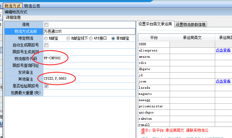 附件万邑通ISP 物流参数的设置: