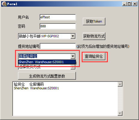 2:选择一个物流方式,点击查询验货仓库,可以得到这个物流方式的验货仓库列表。
