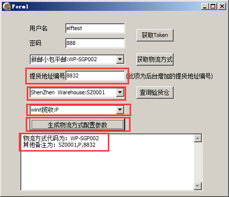 3:选择发货方式,填入提货地址编号,点击 生成物流方式配置参数